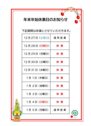 年末年始休業日のお知らせ