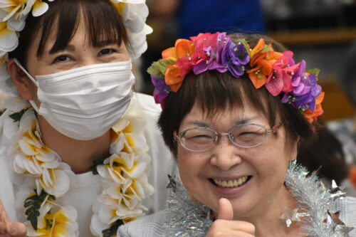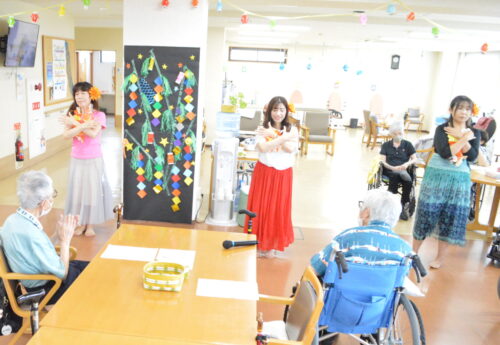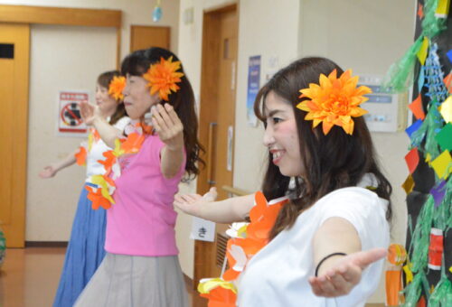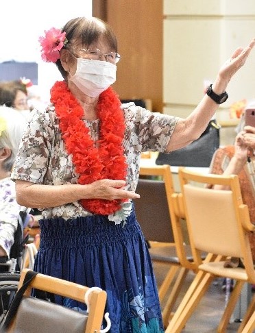 女性利用者様、スタッフがフラダンスの衣装を着てフラダンスを披露し、見ている方々も合わせて踊られていました。